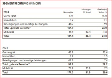 Die privatwirtschaftlichen Bereiche mit der Gornergrat Bahn (GGB), den Immobilien sowie den Beteiligungen und sonstigen Leistungen erwirtschafteten einen Rekordgewinn von CHF 24 Mio. (CHF +1.7 Mio.) Gesamthaft resultiert daraus für die Gruppe ein Ergebnis von CHF 23.0 Mio. und damit eine Abnahme um CHF 6.6 Mio. gegenüber dem Rekordniveau des Vorjahres. Der Rückgang ist in erster Linie auf unwetterbedingte Mehraufwände zurückzuführen. Der Personalbestand betrug Ende 2024 durchschnittlich 694 Vollzeitstellen (+9).